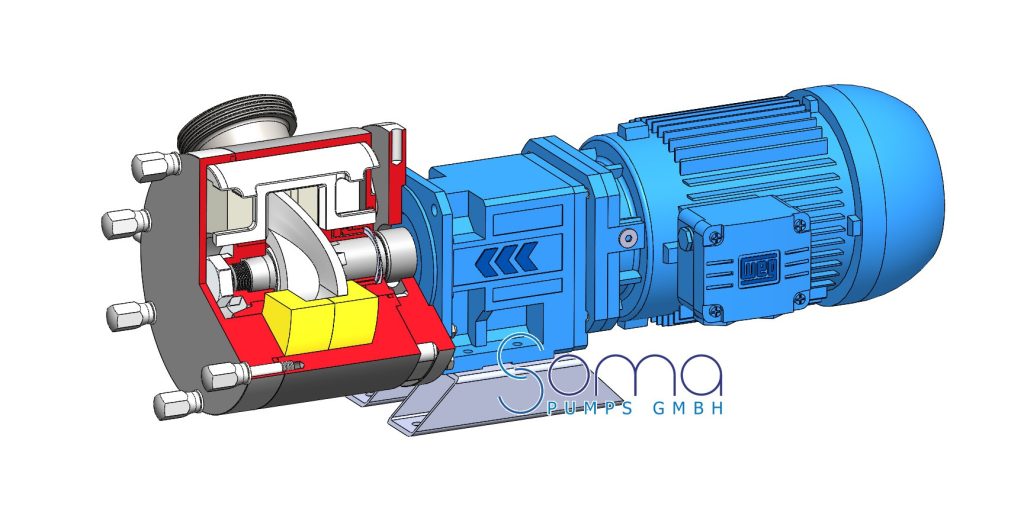 With the SCN-D series of the SOMA SINUS SODIAL®, SOMA PUMPS GmbH was the first to launch a new development on the market. The further development of the SOMA SINUS SODIAL® pump as a monobloc version is a SOMA SINUS SODIAL® pump, which does not require a bearing block, coupling and a complex base plate. In this version, the SOMA SINUS SODIAL® pump is therefore flanged directly to the drive.