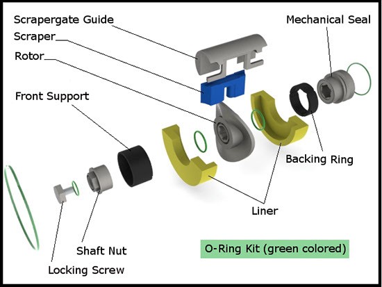 A scraper gate surrounding the rotor provides the divide between the suction and the pressure side, the inlet and the outlet. The rotor does not run against the housing or the cover, as it sits in between liners that are replaced over time, meaning the housing has decades of staying power. In fact, SOMA Pumps GmbH offers a lifetime guarantee for the cover and the housing.